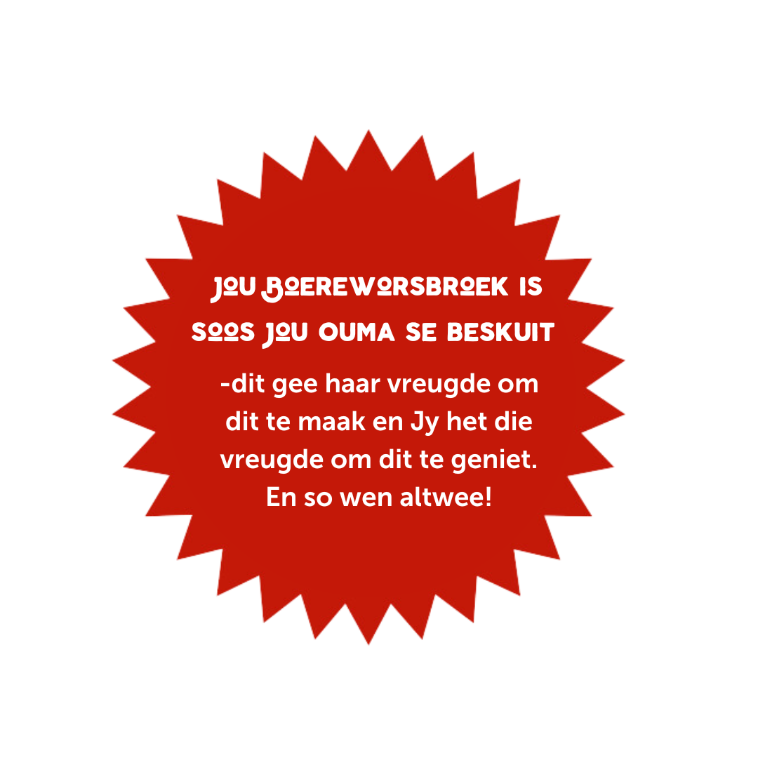 Jou gemaklike Boereworsbroek is gemaak van premium 100% rekkatoen met 'n sagte rek om jou middel. Links agter op die been en regs voor op die been is daar 'n idioom, sêding of prentjie gedruk soos wat jy gekies het. In groottes van Sprinkaanboud (Small) tot Blouwildebeesboud (5XL) is daar 'n broek vir elkeen! Ons unieke verpakking maak van die Boereworsbroek 'n egte boerworservaring! Jy gaan heerlik kan slaap in die broek, of wakkerbly of braai. Geniet jou Boereworsbroek soos jy wil!